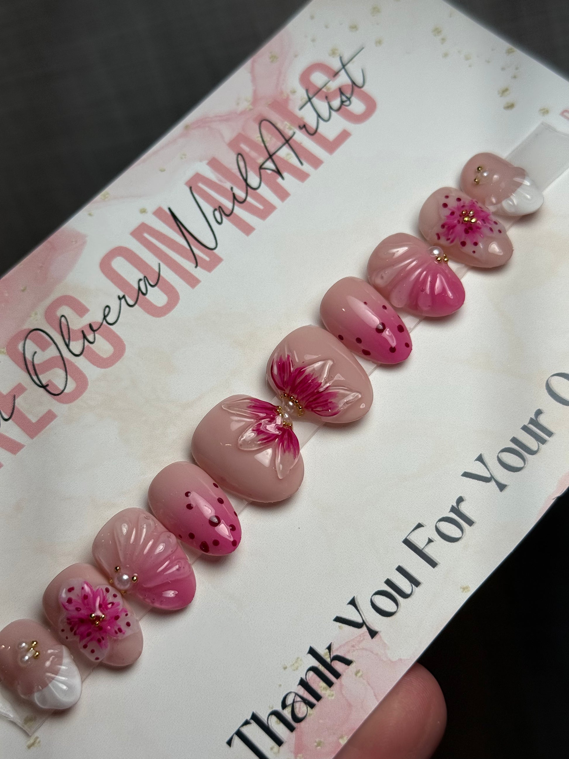 A whimsical floral nail set featuring soft pastels, delicate blossoms, and a magical hand-painted finish.
