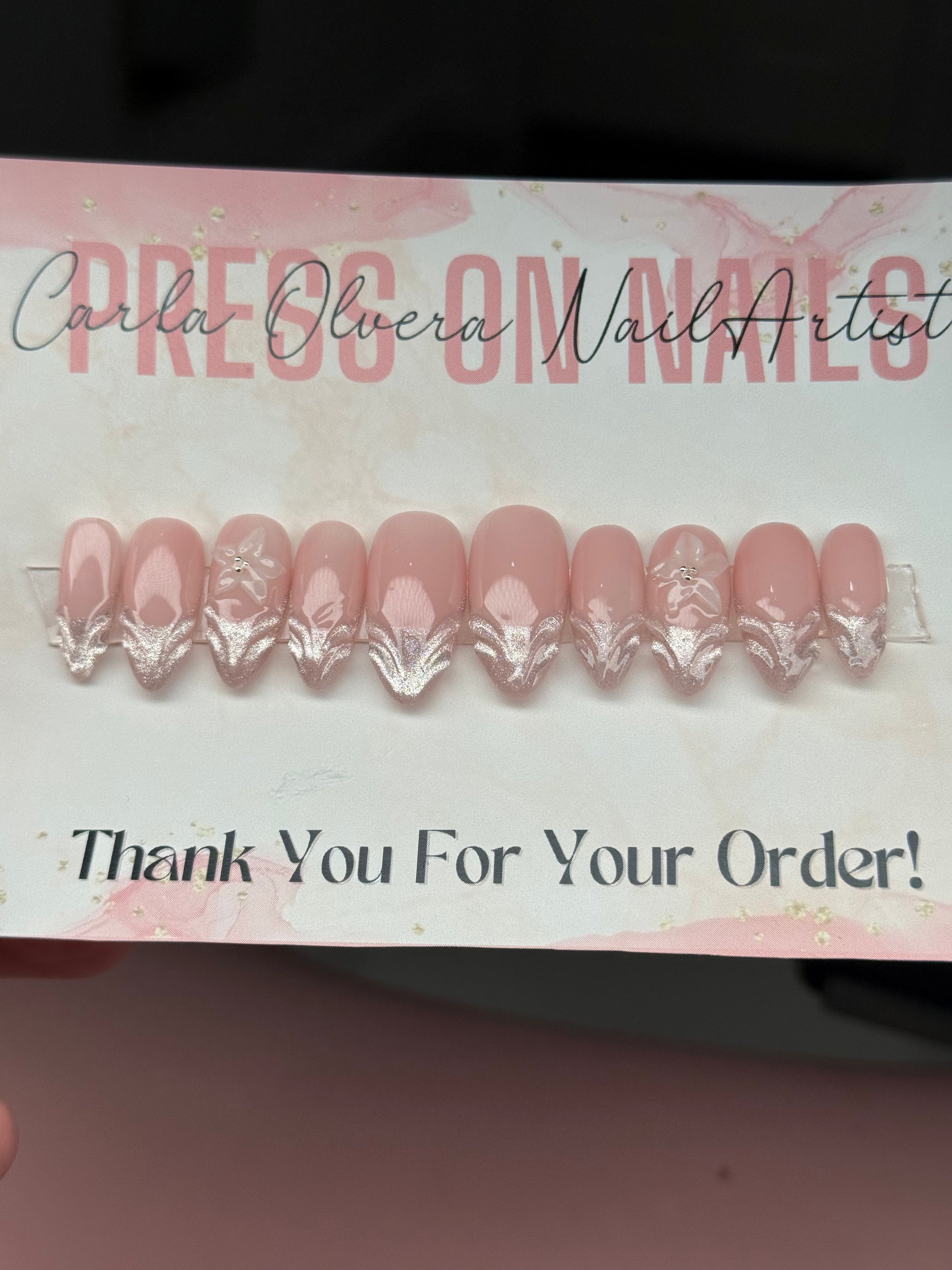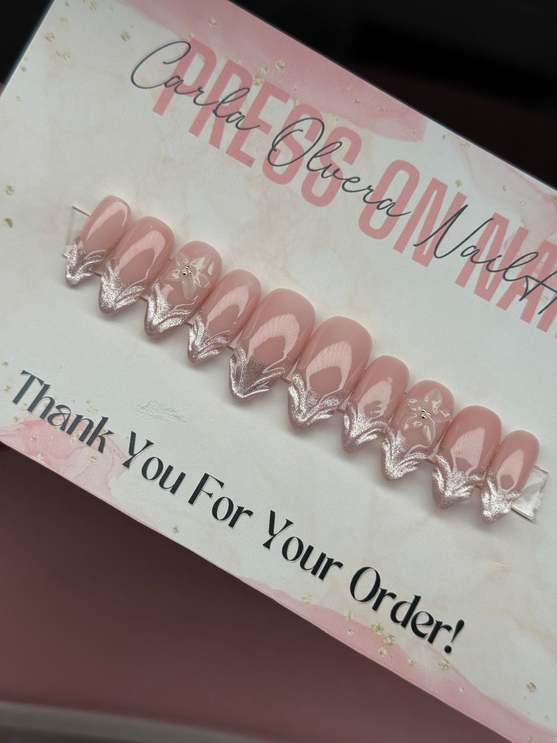 handcrafted pink press-ons feature a soft blush base paired with sparkling silver glitter V-tips and subtle 3D floral accents, creating the perfect blend of glam and grace.